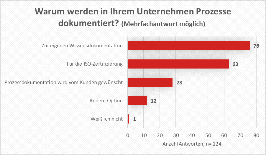 Warum werden in Ihrem Unternehmen Prozesse dokumentiert? Als Hauptgrund nannten 76 der insgesamt 124 Befragten die „eigene Wissensdokumentation“. Knapp die Hälfte aller Befragten wählten die anstehenden ISO-Zertifizierungen als Grund für die Prozessdokumentation. Diese Verteilung schlägt sich in allen Unternehmensgrößen in ungefähr dieser Verteilung (siehe unten) nieder.