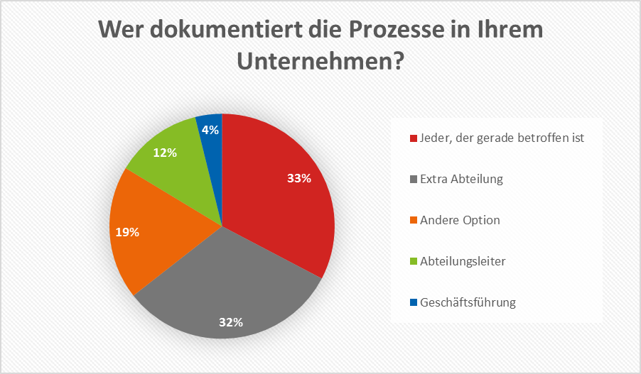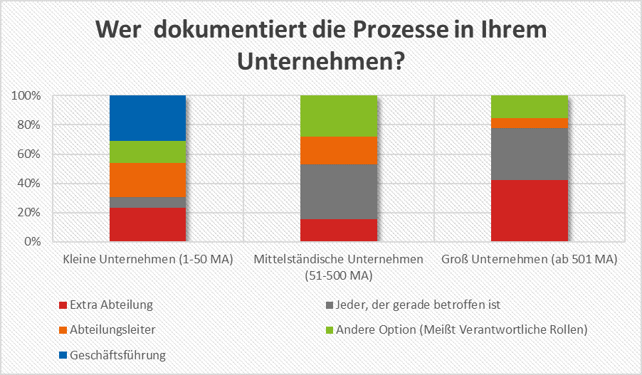Die Umfrageergebnisse zeigen, dass das Thema Prozessdokumentation vor allem in kleinen Unternehmen (1-50 Mitarbeitern) oftmals von einzelnen Personen, wie Führungskräften, betrieben wird. Im Gegenzug dazu setzt man in großen Unternehmen (ab 501 Mitarbeitern) verstärkt auf extra Abteilungen und über die Auswahl „Andere Option“ genannten Rollen wie Prozessverantwortliche. Diese Abteilungen oder Rollen sollen sich dem Prozessmanagement und der Koordination der Prozessdokumentation widmen (siehe unten).
