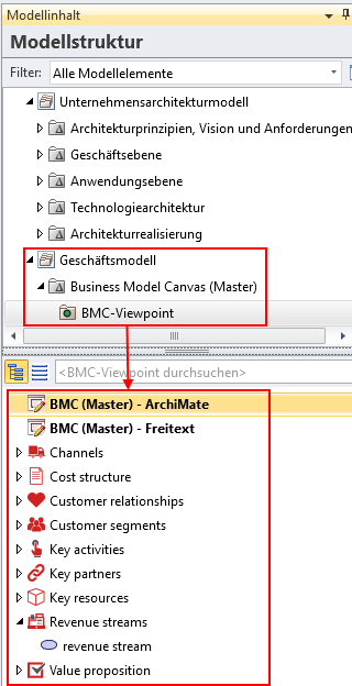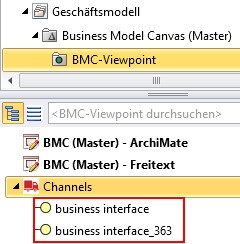 - ArchiMate®-Elemente für die BMCs werden je Modell im Paket „BMC-Viewpoint“ unterhalb des jeweiligen BMC-Stereotyps (z. B. „Channels“) abgelegt
